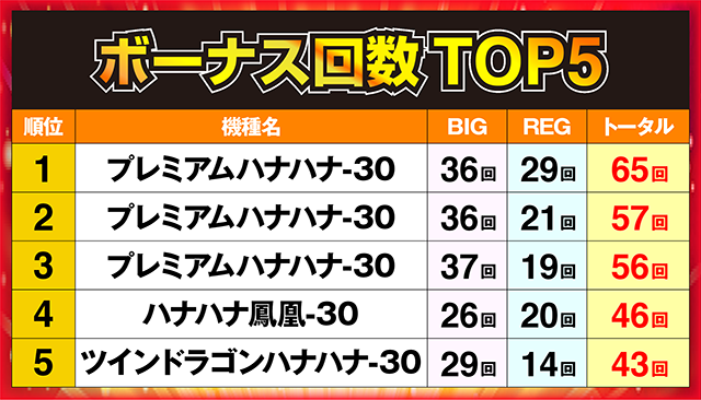 TOP3には「プレミアムハナハナ-30」がならび、ボーナス回数65回の台が首位を獲得!