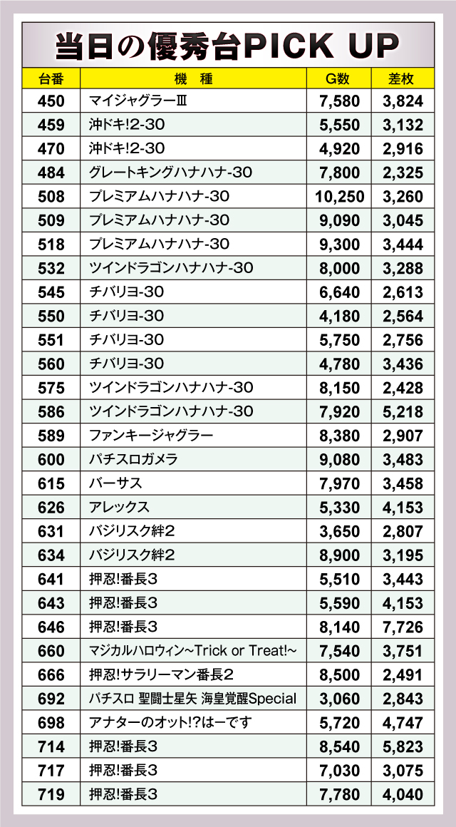 『ジャグラー』シリーズや『ハナハナ』シリーズは言うに及ばず、『沖ドキ!2-30』や『チバリヨ-30』など、完全告知マシンが猛威を振るっていた。さらには『押忍!番長3』『SLOTバジリスク~甲賀忍法帖~絆2』といった10台以上機種からも優れた結果が生まれていたぞ!