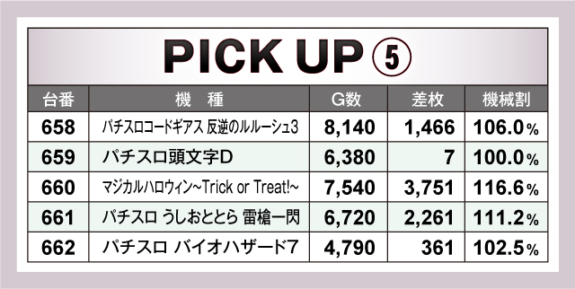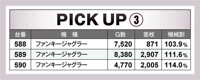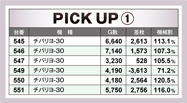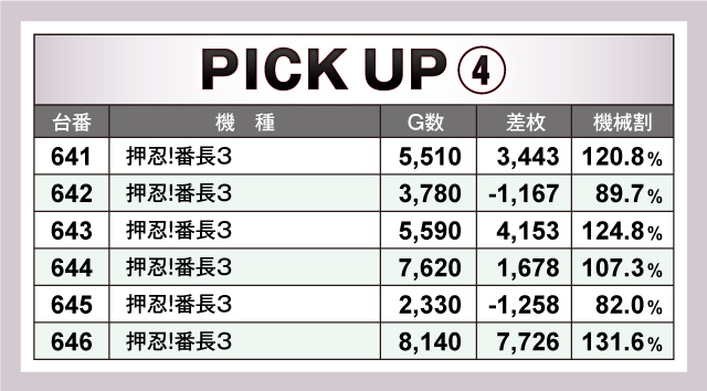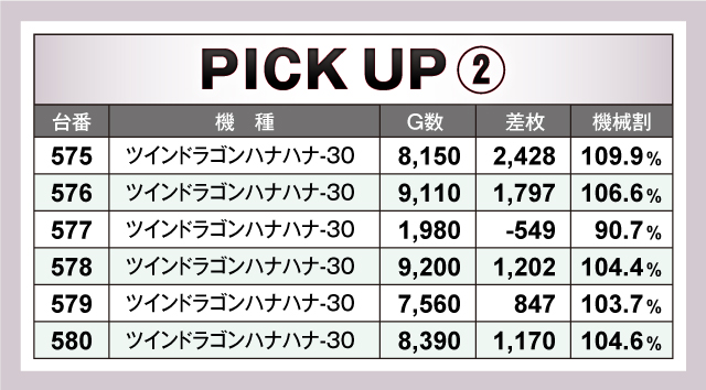 今回のピックアップ機種は5つ。特筆すべきは6台並びで輝きを放っていた『チバリヨ-30』『ツインドラゴンハナハナ-30』『押忍!番長3』だろう。またバラエティーコーナーにおいても5台並びで優秀台の挙動丸出しな光景を取材班が目撃している。