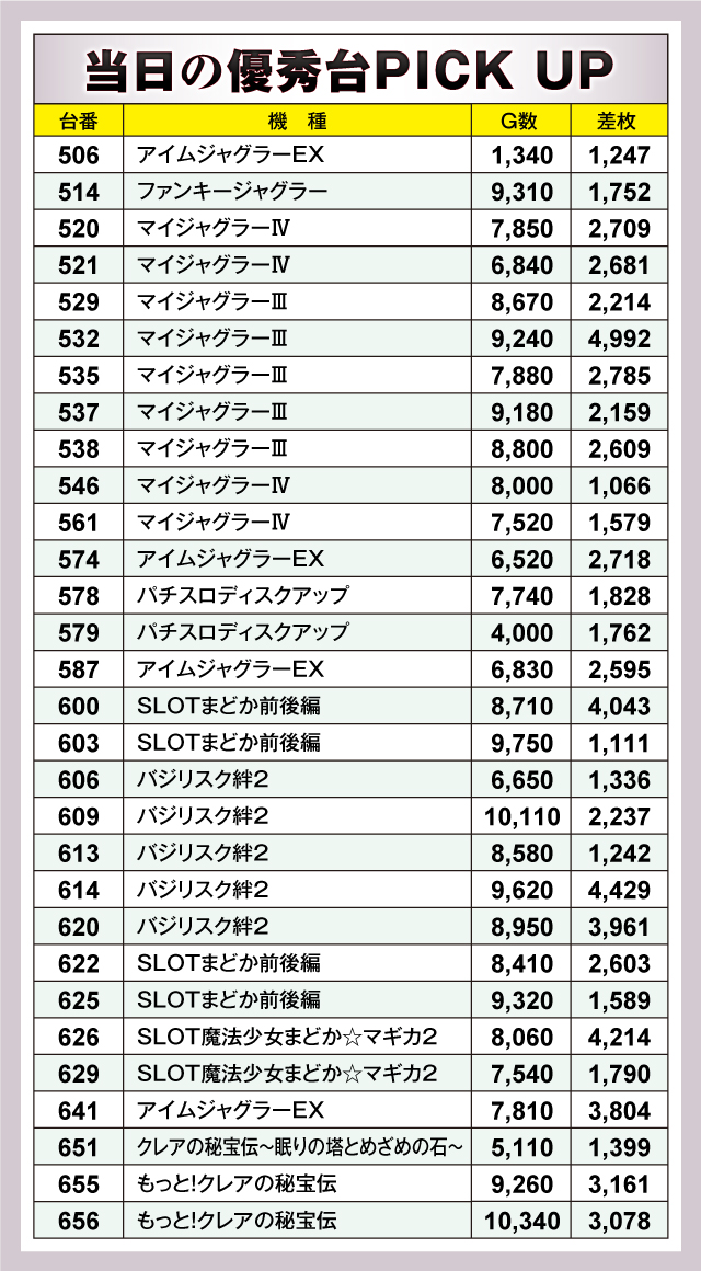 まず注目は『マイジャグラーⅢ』5台の高稼働と好調。その他『SLOTバジリスク~甲賀忍法帖~絆2』5台で差枚数プラス1万3千枚突破が目立つ結果となった。