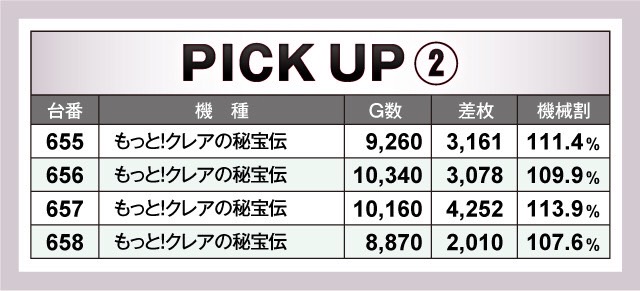 また当日印象に残ったのは、2機種が横並びで盛り上がっていたこと。『パチスロ頭文字D』はもちろん、『もっと!クレアの秘宝伝 女神の歌声と太陽の子供達』は終日安定した挙動を見せていた。