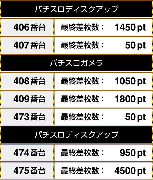 閉店時には406番台から409番台、473番台から475番台までの2箇所にプラスptが並ぶ!!