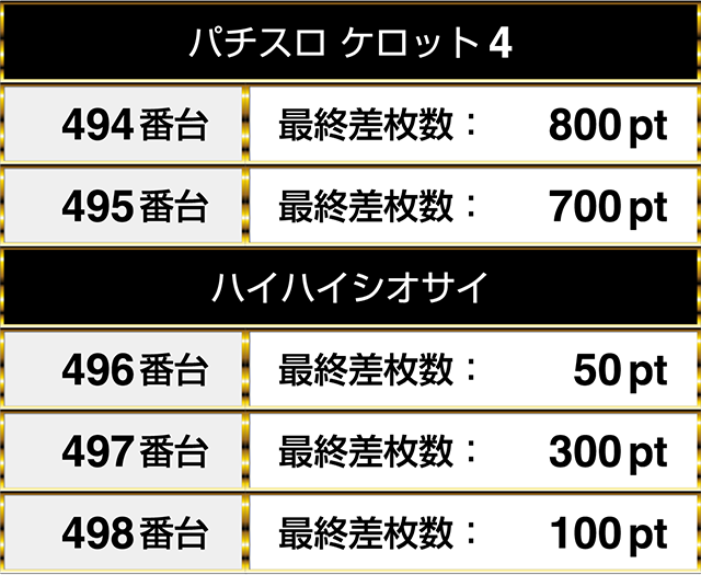 『パチスロ ケロット4』の2台は『ハイハイシオサイ』の3台と並んでプラスptとなった。