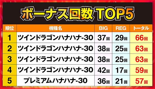 ボーナス回数66回を記録した1位の台を筆頭に、4位までを「ツインドラゴンハナハナ-30」が独占!