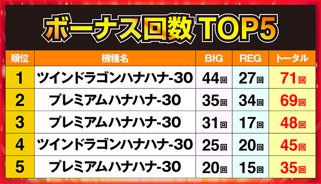 ボーナス回数70回以上の「ツインドラゴンハナハナ-30」が堂々のトップ!