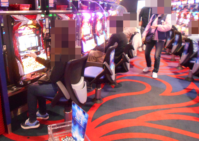 店内には多くのプレイヤーが集まっており、パチンコとパチスロの両方がにぎわっていた。