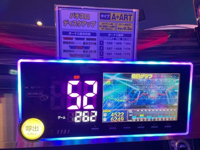 平均ゲーム数は9,000Gに届くかという高稼働で、3分の2がプラスと3台全てが勝利とはならなかったが、全台差枚数は+11,000枚超に。夕方以降の盛り上がりは店内でもナンバーワンだった。