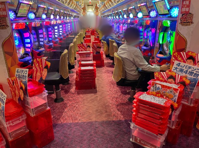 同店では36台設置の主力機種『P大海物語4スペシャル』では22時を回ってもドル箱の多さに驚かされた。