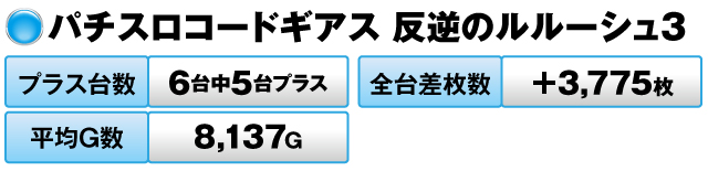 続いては全台差枚数プラス3千枚クラスをチェック。『パチスロコードギアス 反逆のルルーシュ3』『鬼浜爆走紅蓮隊 狂闘旅情編』『プレミアムハナハナ-30』の3機種だ。