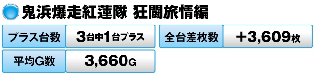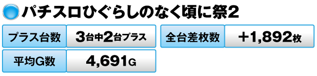 平均ゲーム数10,000G弱という抜群の稼働、こちらも3分の2プラスと3台全ての完全勝利を逃したが、全台差枚数は+6,000枚弱を達成した。