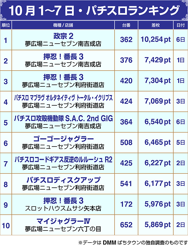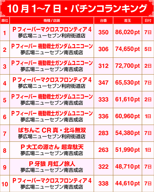 【パチンコ10月1~7日ランキング】