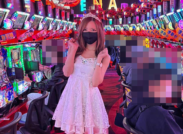 エレガントなドレス風の衣装にお着替えをして、パチスロの「アイムジャグラーEX」で実戦しちゃいます(*´ー`*)