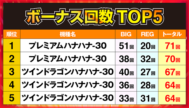 67回の好記録を残した1台を筆頭に、3位以下には「ツインドラゴンハナハナ-30」が並んだ。