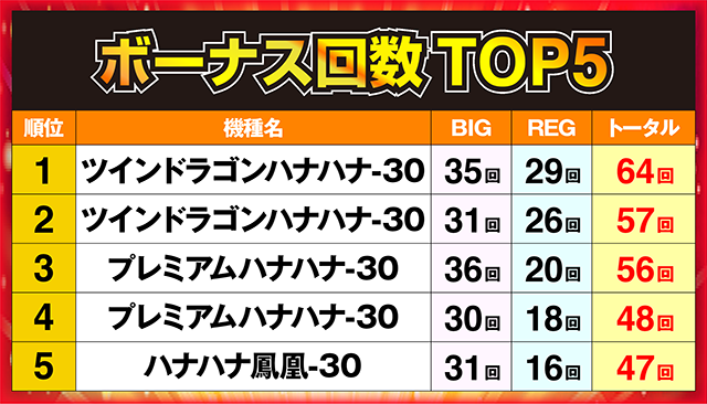 ボーナス回数64回を記録した「ツインドラゴンハナハナ-30」の1台がNo.1!