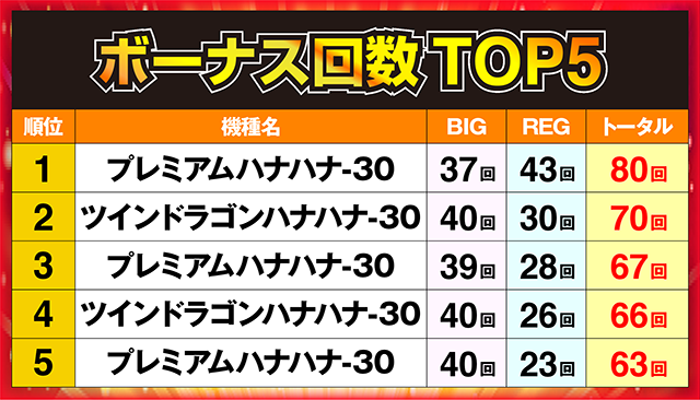 ボーナス回数60回以上の台が並ぶなかで、1位に輝いたのは、80回を記録した「プレミアムハナハナ-30」!