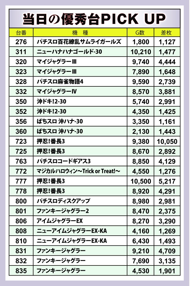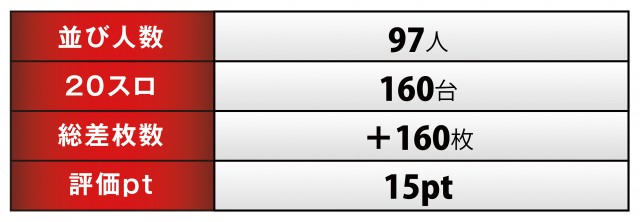 全台が[1,000円/47枚] スロである同店、全体ではトータルの差枚数が+160枚となり、前回には及ばなかったものの「ヒーローズレポート」リニューアル後2連勝、「英雄」実施全体では11連勝といった破竹の勢いを見せてくれた。栃木県内のみならず全国的にも注目の店舗であることは間違いなし!