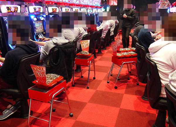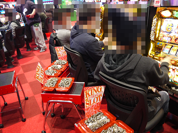 朝イチの傾向は前日と大きく変わらず、入場抽選で早い番号をゲットした人の多くが、47枚/1000円パチスロの「バジリスク~甲賀忍法帖~絆」の席を確保。