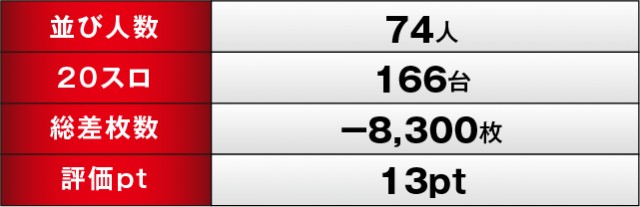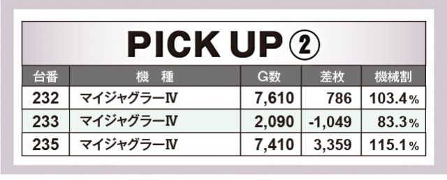 パチスロ全体では、惜しくもマイナス差枚となったが、ピックアップ機種をはじめとして、多彩な機種が盛り上がりを見せていた。稼働の良かった台はしっかり出ており、次回に期待するには十分の内容だったといえよう。