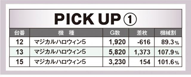 ピックアップ機種では、『マジカルハロウィン5』、『マイジャグラーⅣ』が、プラス台が先行し差枚もプラスだった。