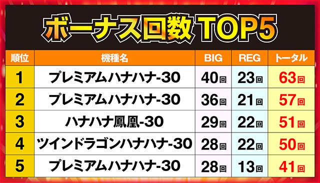 3機種が入り乱れるランキングの1位は、ボーナス回数63回の「プレミアムハナハナ-30」!