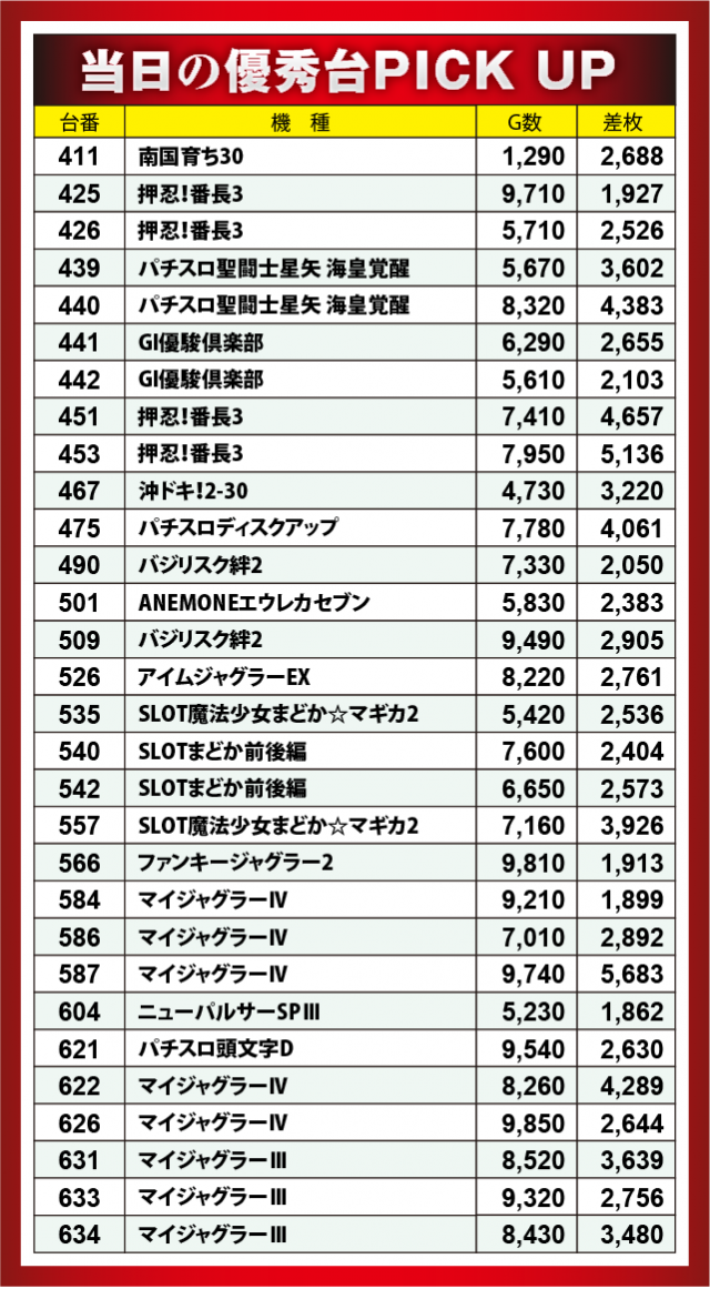当日は「団」参戦とあり、横並び6台の好気配スポットが5か所も見受けられた。上記PICK UP30台の解説で挙げた3機種の他にも、『パチスロ聖闘士星矢 海皇覚醒』や『GI優駿倶楽部』、『SLOTバジリスク~甲賀忍法帖~絆2』が優秀な出玉を残した。