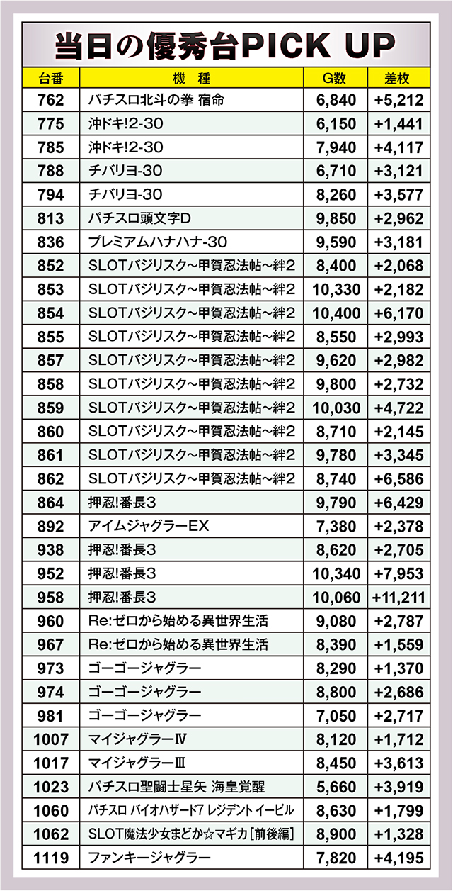 上表をパッと見てまず目につくのが『SLOTバジリスク~甲賀忍法帖~絆2』の固まりっぷり。次いで『押忍!番長3』の万枚記録、そして『沖ドキ!2-30』『チバリヨ-30』『ジャグラー』シリーズの快進撃だろう。常連スロッターのあらゆるニーズに応えるため、様々な機種に優秀台を配置したのは火を見るより明らかだ。