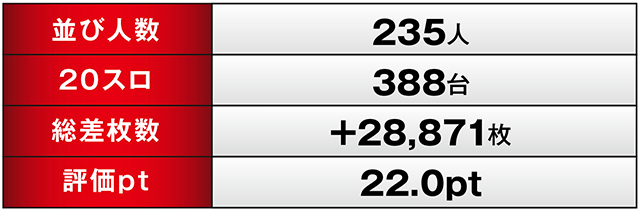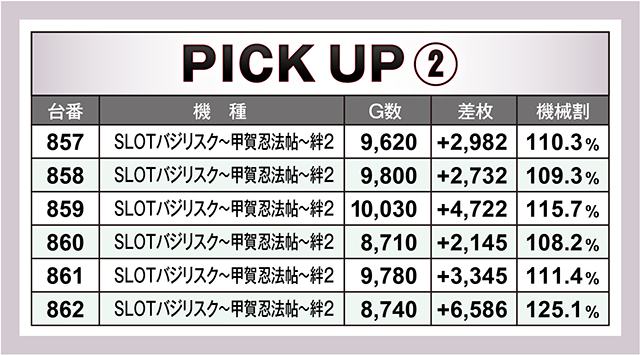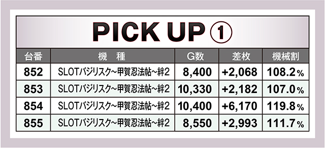 パチスロコーナーを訪れた方全員が目を疑うほどの結果を見せた『SLOTバジリスク~甲賀忍法帖~絆2』。なんと10台全てが並びでプラスとなっており、3,000枚超えも4台。『SLOTバジリスク~甲賀忍法帖~絆2』が全台系だったと確信するに十分な結果である。