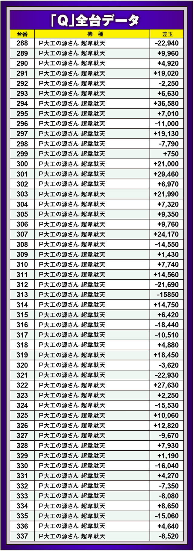 50台もの台数となると、意図せずヘコむ台もあり、トータルでプラスにするのは至難の業。しかしそれを易々とやってのけたのだから驚きだ。全50台の『P大工の源さん 超韋駄天』のトータル差玉はなんと+149,870玉。1台あたりの平均差玉は+2,997玉というのだから、まさに韋駄天の名に恥じぬ疾走感!
