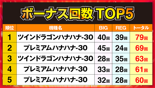 5台すべてが60回以上を記録しているなかで、79回の「ツインドラゴンハナハナ-30」が1位!