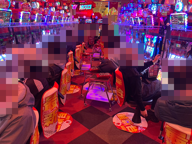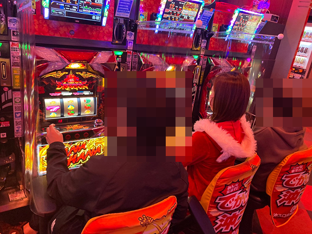 パチスロをみてみると、新台の「沖ドキ!DUO-30」や「プレミアムハナハナ-30」などの沖スロがとくに活況となっており、たくさんの笑顔が広がっていました。