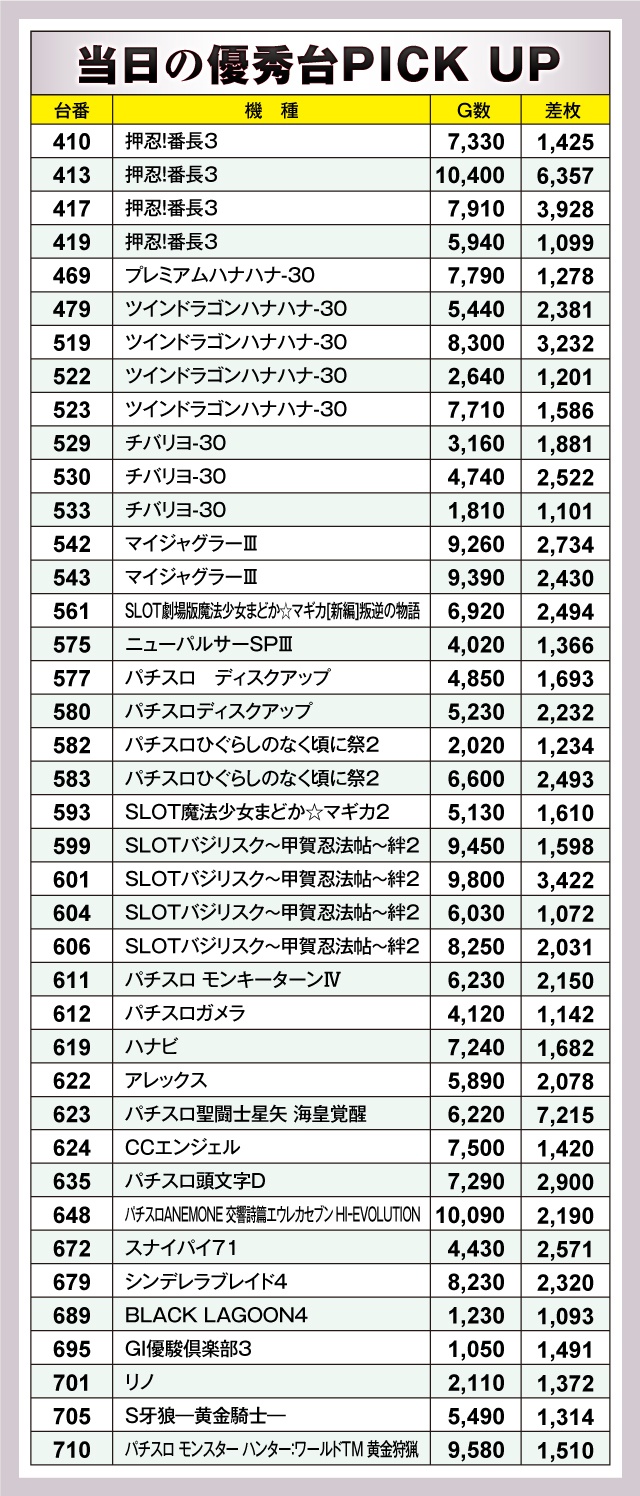 優秀台を見てみると、『パチスロ聖闘士星矢 海皇覚醒』の623番台が+7,215枚の大勝利。その実力を見せつけた。「ヒーローズレポート」の定番『押忍!番長3』も負けてはいない。413番台が+6,357枚でG数10,400Gを記録。また、417番台も+3,928枚と優秀だった。それに続いたのが『SLOTバジリスク〜甲賀忍法帖〜絆2』の601番台で、+3,422枚を記録した。以下、+3,232枚の『ツインドラゴンハナハナ-30』519番台などが盛り上がりを見せていた。