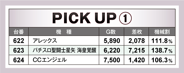 ピックアップ機種では、『アレックス』、『パチスロ聖闘士星矢 海皇覚醒』、『CCエンジェル』の並びの3機種が期待に応えていた。