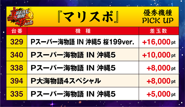 329番台の「Pスーパー海物語 IN 沖縄5 桜199ver.」が+16,000ptを記録した。