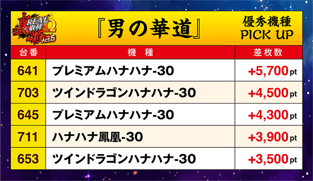 「ハナハナ鳳凰-30」の711番台も+3,900ptを記録と、全体的にボリューム感があった。