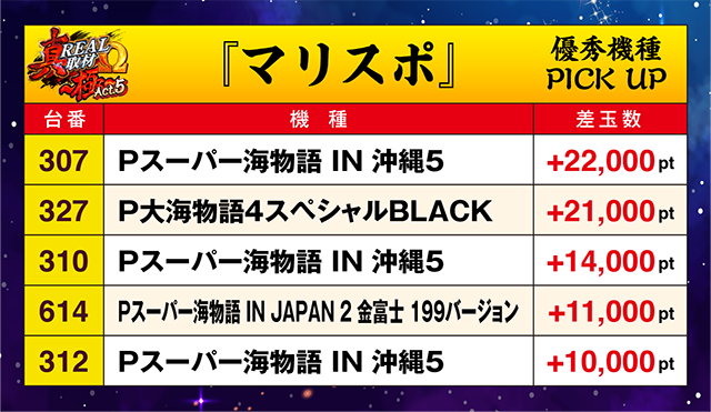 「Pスーパー海物語 IN 沖縄5」の307番台、「P大海物語4スペシャルBLACK」の327番台は+20,000pt以上を記録した。