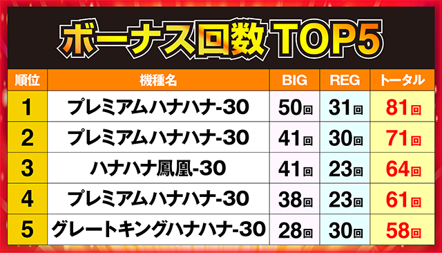 1位と2位には「プレミアムハナハナ-30」がならび、81回のボーナスに当選した台が首位を獲得。