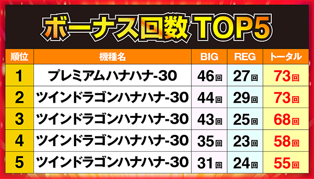 「ツインドラゴンハナハナ-30」も1位と同じボーナス回数の台があり、5位までに4台が入った。