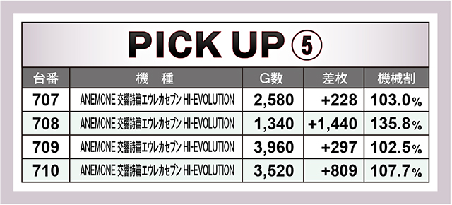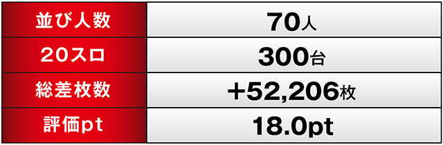 パチスロコーナーにて納得の光景を目撃することとなった今回だが、その躍進は数値にもバッチリ表れていた。前回を大きく上回るスロ総差枚+52,206枚。これはスロ平均差枚が+174枚だったことを表しており、いかに濃密な1日だったかが伝わるだろう。