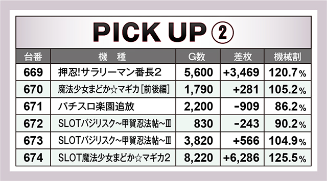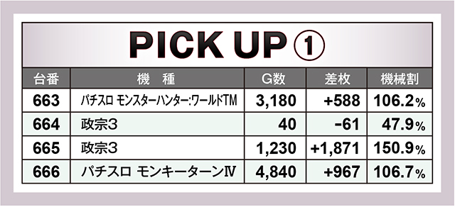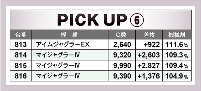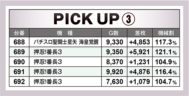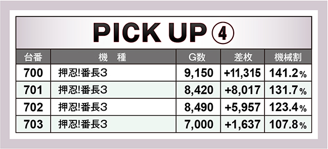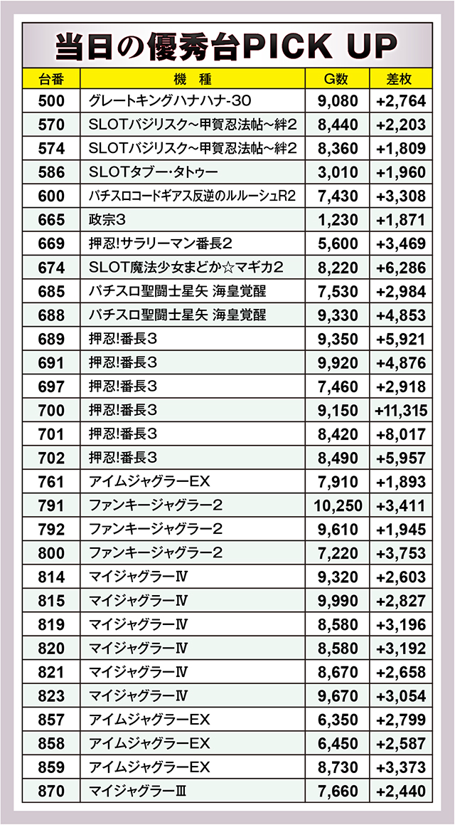 今回も様々な機種から優秀台を確信させるに十分な結果が誕生。中でも目立った活躍を見せたのは、5,000枚超え×2台、8,000枚超え、11,000枚超えの記録を矢継ぎ早に叩き出した『押忍!番長3』だろう。さらにみんな大好き『ジャグラー』シリーズコーナーでは、ボーナスサウンドが鳴りやまなかったようだ。