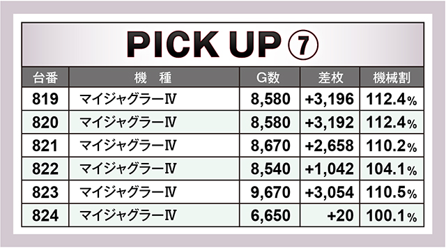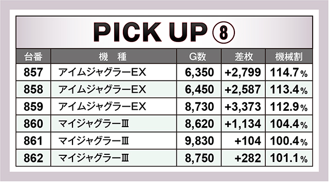 前回11/1は並びでの良記録は6ヶ所を確認することができたが、今回はそれを上回る8ヶ所を確認。人気のAT機から導入されたばかりの新台、さらには常連さんニーズの高いAタイプまで、幅広く網羅しているのが見て取れる。しかも8ヶ所中6ヶ所が全台プラスというのだから、優秀台としての手腕をしっかり発揮してくれたようである。