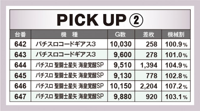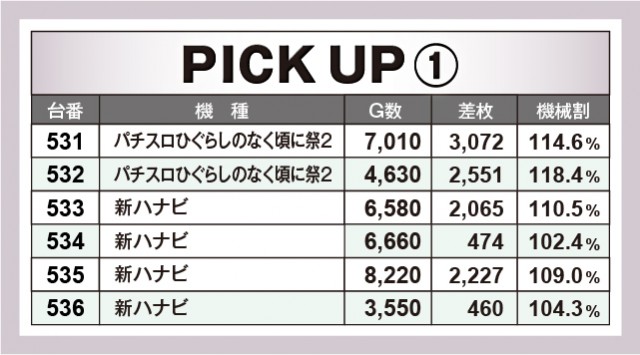 ピックアップ機種では、『パチスロひぐらしのなく頃に祭2』と『新ハナビ』が並ぶ531〜536番台、『パチスロコードギアス 反逆のルルーシュ3』と『パチスロ 聖闘士星矢 海皇覚醒Special』の642〜647番台という並びが、いずれの台も差枚がプラスという好成績をマークした。