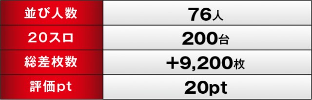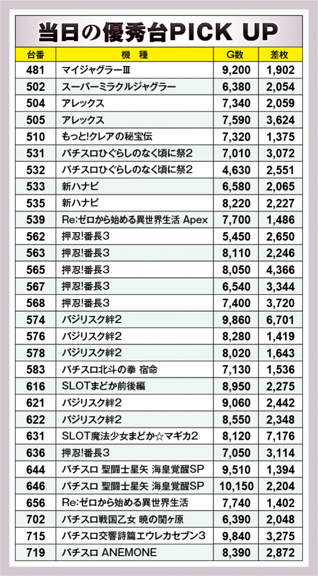 優秀台をチェックすると、差枚+7,176枚をマークした『SLOT魔法少女まどか☆マギカ2』の631番台、それに続く差枚+6,701枚を記録した『SLOTバジリスク〜甲賀忍法帖〜絆2』の574番台、そして+4,368枚だった『押忍!番長3』の565番台と、定番人気機種が結果を残した。その他の機種もコンスタントに+2000枚以上を記録していた。