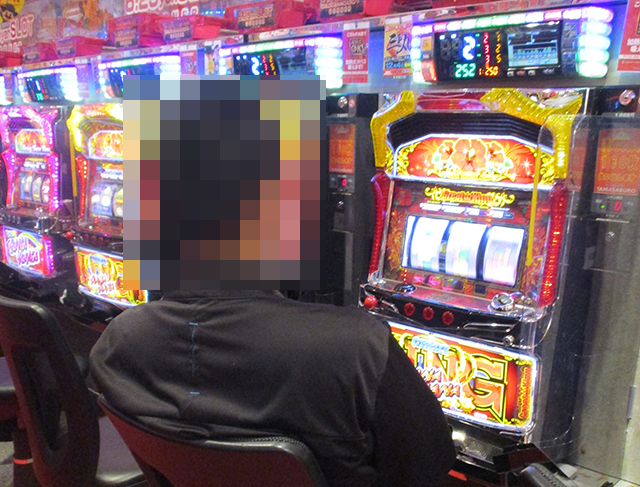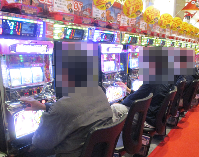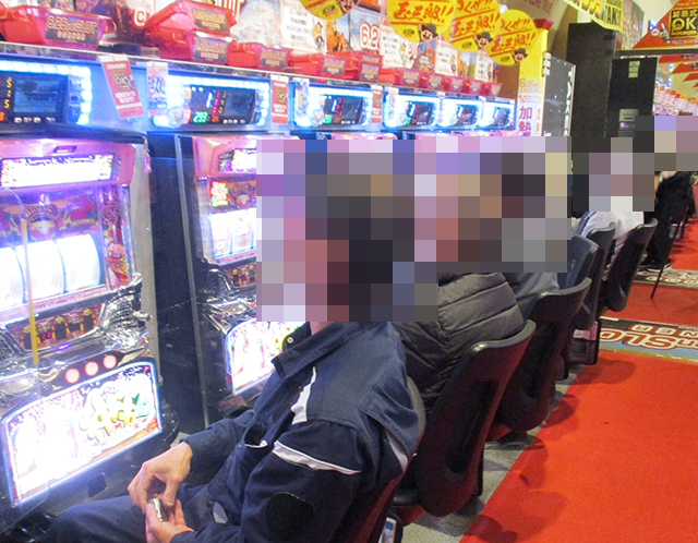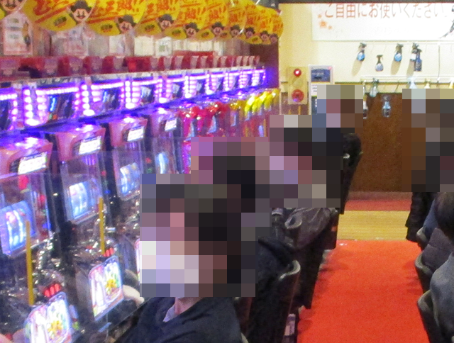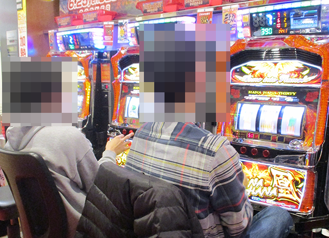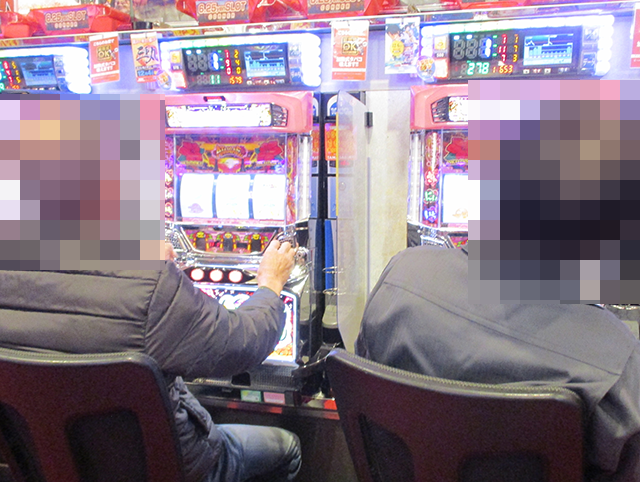 沖スロで構成されたシマの端に4台が並んでおり、取材時には2台が稼働。