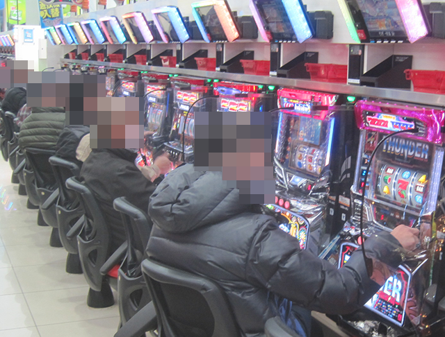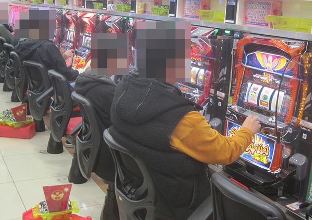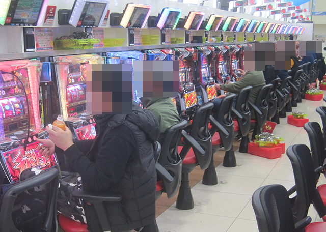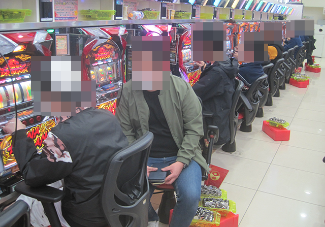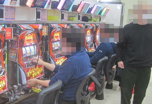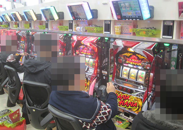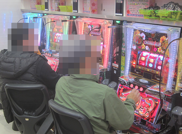 店内には「プレミアムハナハナ-30」や「チバリヨ-30」などが設置されており、取材時はあちこちに遊技を楽しむプレイヤーの姿があった。