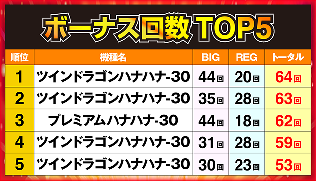 ボーナス回数64回の台を筆頭に、「ツインドラゴンハナハナ-30」の4台がTOP5入り!