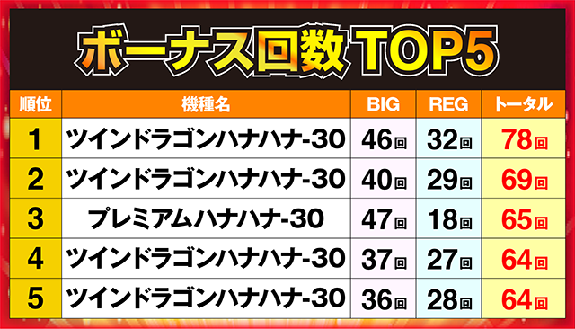 「ツインドラゴンハナハナ-30」は4台がTOP5に入り、78回のボーナスに当選した1台が堂々のトップ!