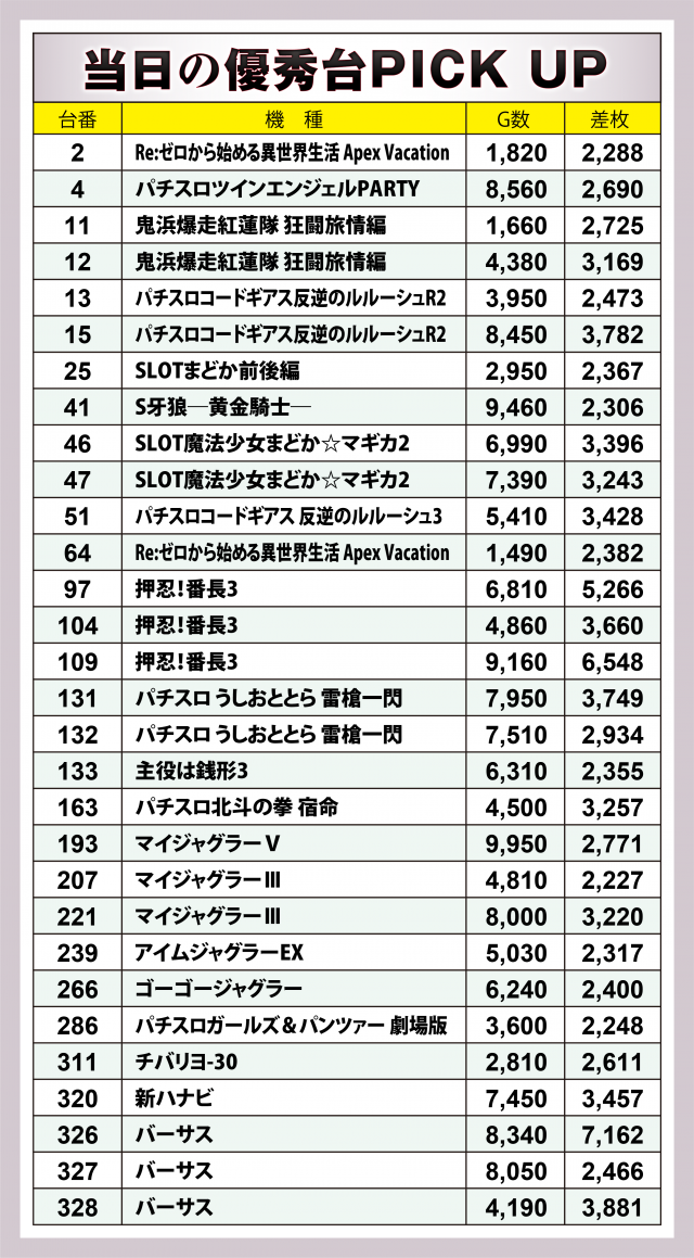 『番長3』以外にも様々な機種でドル箱使用が目についた。優秀PICK UP30台では全てがプラス差枚数2千枚以上だったのも印象深い。