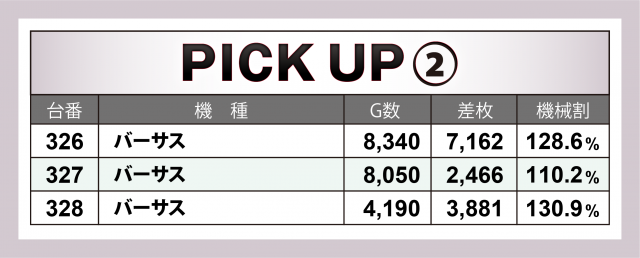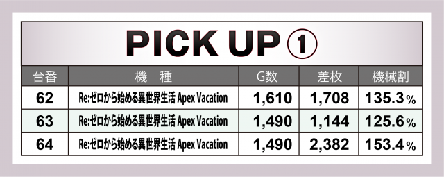 また、この日は3台横並びの好況スポットが2か所出現。中でもハイスコアを残したのがボーナスタイプの『バーサス』。3台トータルで差枚数+1万3千枚を超えた! 一方、3台全てがプラスとなった『Re:ゼロから始める異世界生活 Apex Vacation』だが、平均ゲーム数が伸びなかった。もっと稼働していればもうひと伸びが望めた!?