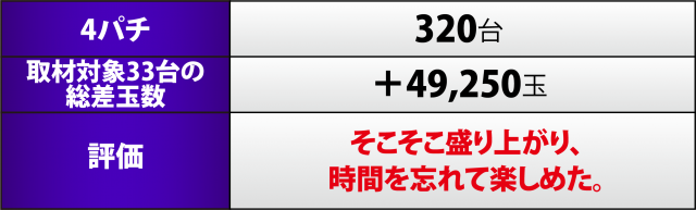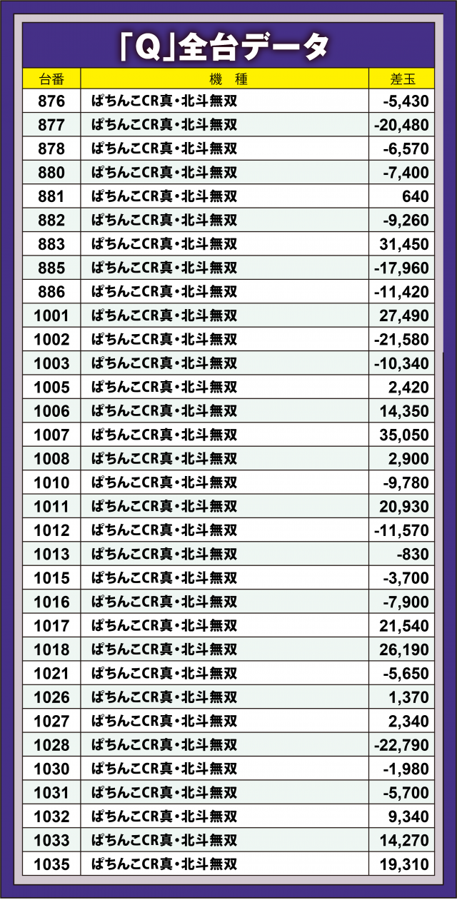 当日の4パチは同店の「ヒーローズレポート」では恒例となる『ぱちんこCR真・北斗無双』が取材対象に。Q参戦の中、半数弱がプラス台と少なめに思えたが、トータル差玉数は+5万発弱、トップスコアの台は+3万発を記録していた。