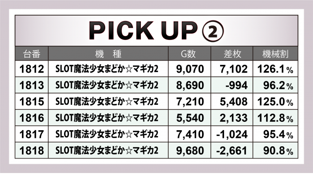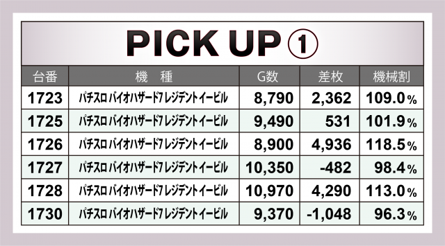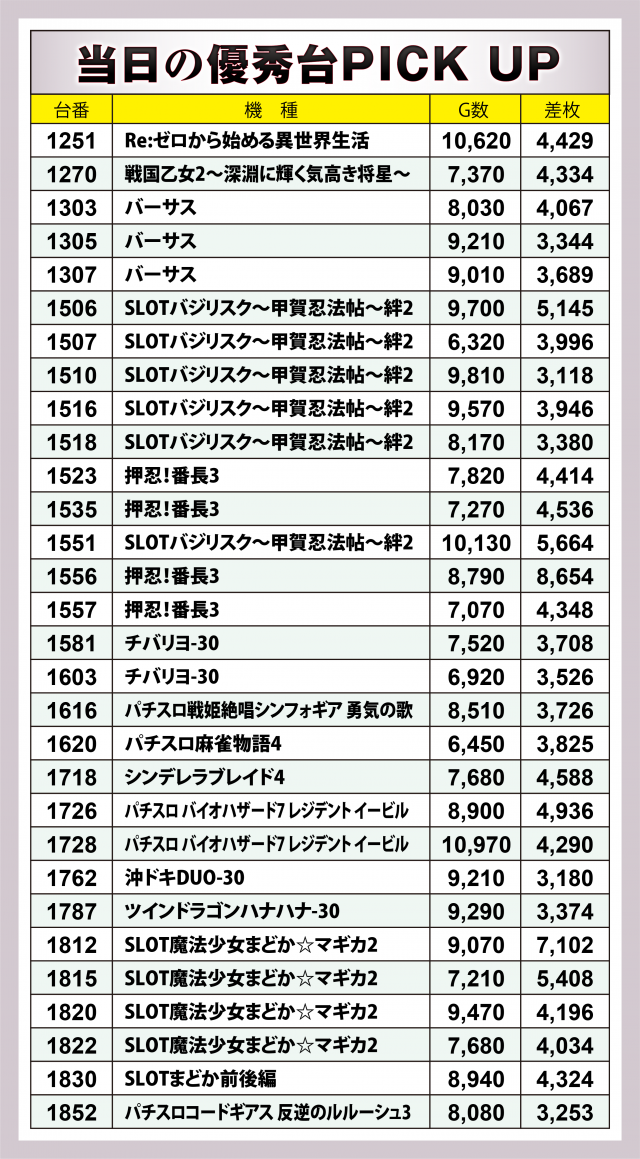 では当日の優秀30台PICK UPから振り返っていこう。データをチェックすると30台全てが3千枚以上のプラス差枚数を記録、後述する横並び好況スポット以外では『バーサス』『SLOTバジリスク~甲賀忍法帖~絆2』を始めに差枚数+4千~5千枚クラスの台がゴロゴロといった好成績を残した。